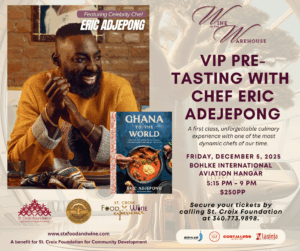 This year’s theme, The Spirit of Philanthropy: Rooted in Place, reflects the heart of St. Croix — its culture, resilience, and community spirit. Guests will experience 45+ curated wines from CC1, gourmet dishes from St. Croix’s leading chefs, and a special culinary journey guided by Chef Eric Adjepong, Top Chef finalist and Food Network host. Chef Eric recently opened his acclaimed Washington, D.C. restaurant Elmina and released his debut cookbook Ghana to the World, bridging West African and Caribbean flavors in a celebration of shared heritage.